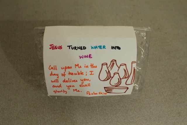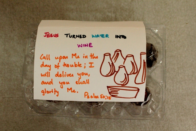 Give each child a long strip of cardboard. Stick the pots in place using an adhesive. Jesus turned water into vine take ways is good to go!