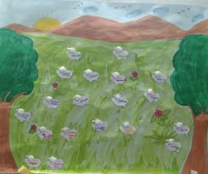 Decorate the chart paper if possible (Refer to the picture). This will be called the class chart and will be used to mark attendance (Put a star next to their sheep on the weeks they are present). Paste a sheep with your name as well, to show that you are also a sheep and only Jesus is the Shepherd.