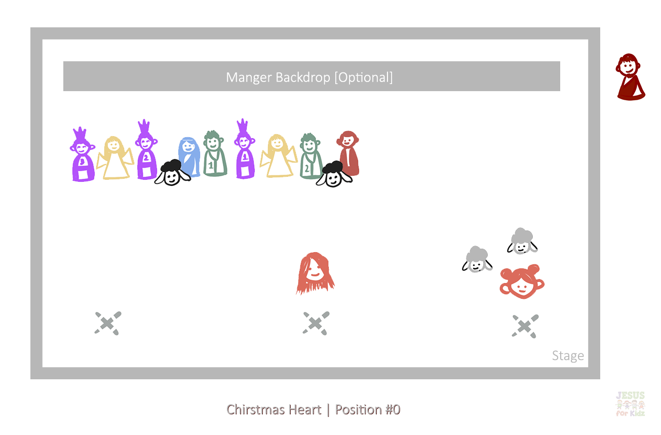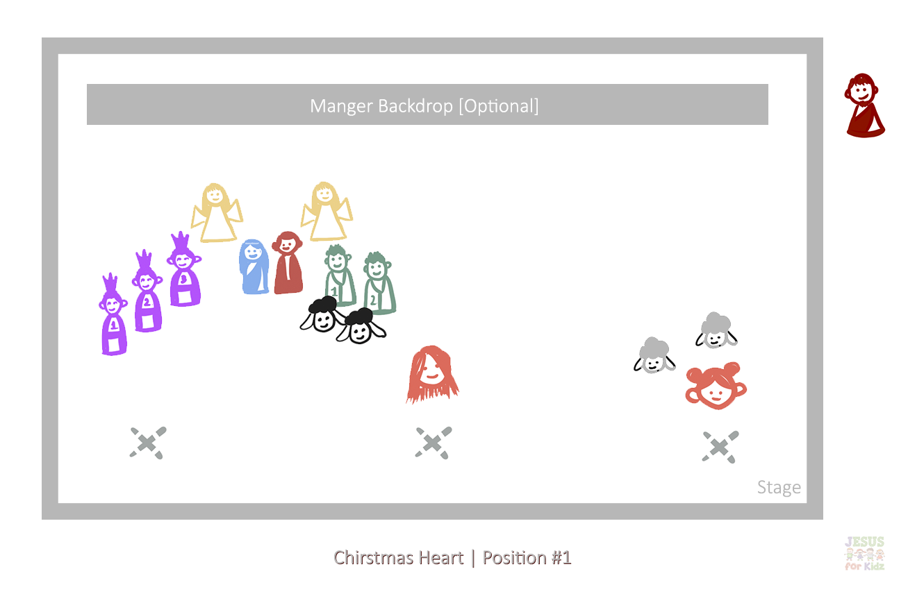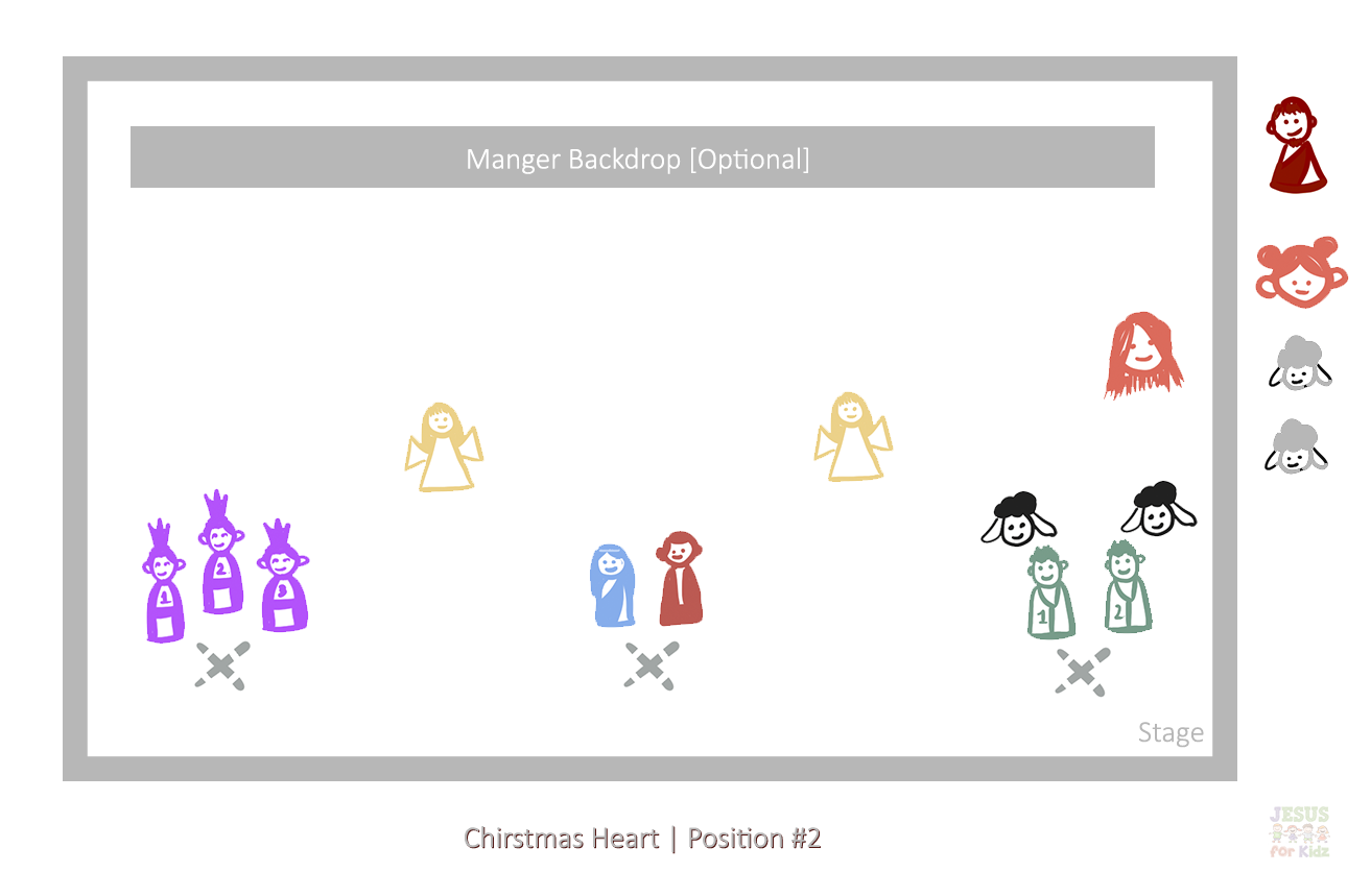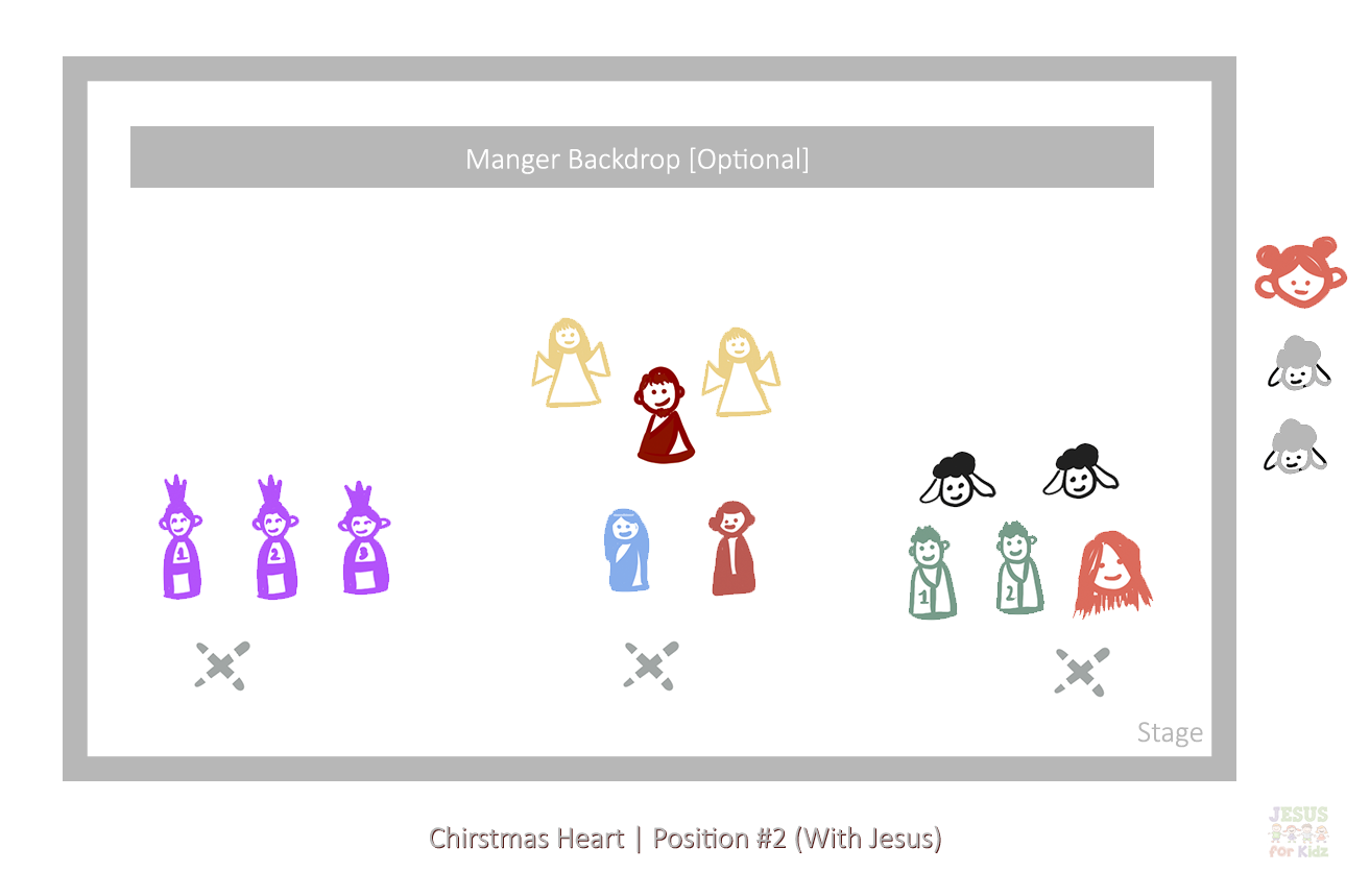 [சரணம் ஆரம்பிக்கும் பொழுது, இயேசுவைபோல் நடிப்பவர் மேடையின் ஒரு முலையில் இருந்த நடந்து வரவேண்டும். முழங்கால் இட்டிருக்கும் அக்கா மற்றும் பொம்மைகளுக்கு ஏற்கனவே தயாரிக்கப்பட்டுள்ள சுத்தமான காகித இதயத்தை தரவேண்டும். பாடல் முடிவில் இயேசு மேடையை விட்டு சென்றுவிடுவார்.]