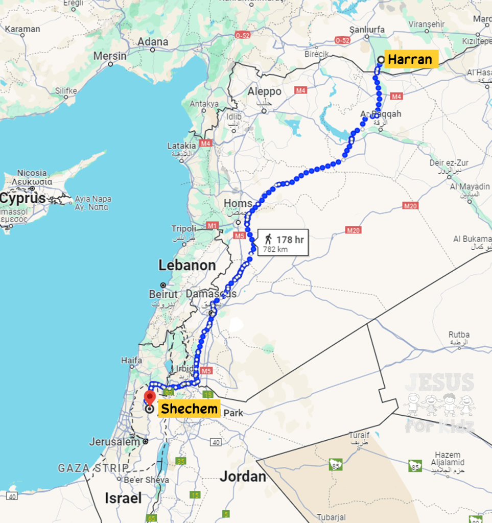 Can you look at the map and find a way from Haran to Shechem in Canaan? The straight route from Haran to Shechem is 782 kilometers as per Google Maps. Abraham did not have Google Maps. So, it would have been a longer route. Can you imagine an old man making this long journey on foot with his entire family and possessions?