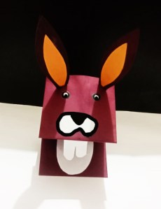 Preparation (Optional): Cut out ears, nose, tongue and teeth on a different colored paper as shown. Alternatively you can ask the kids to directly draw them on the puppet.