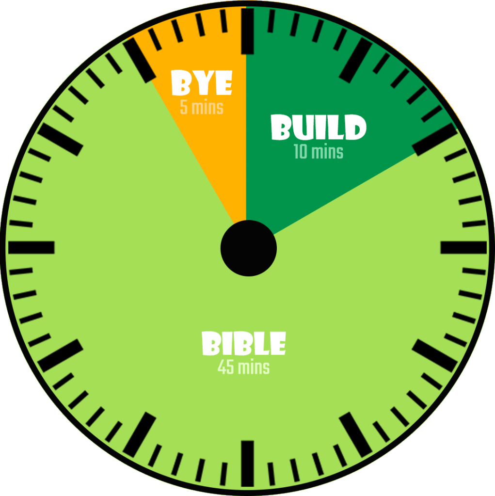 - 3 Segments: Build Time → Bible Time → Bye Time