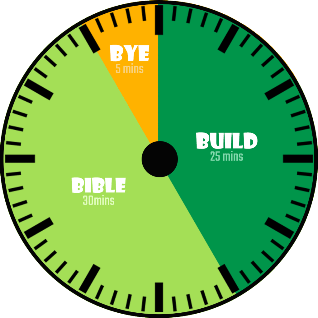- 3 Segments: Build Time → Bible Time → Bye Time