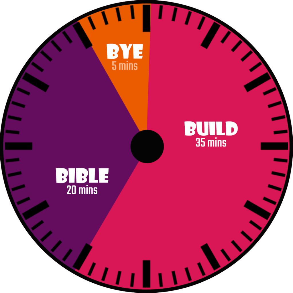 - 3 Segments: Build Time → Bible Time → Bye Time